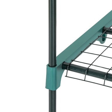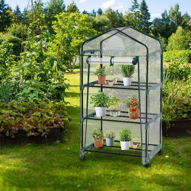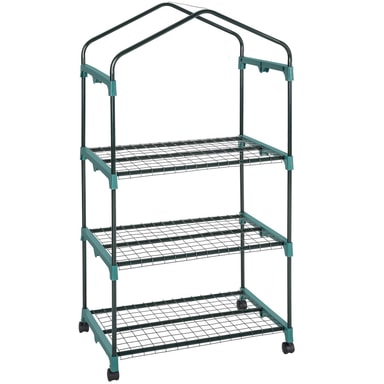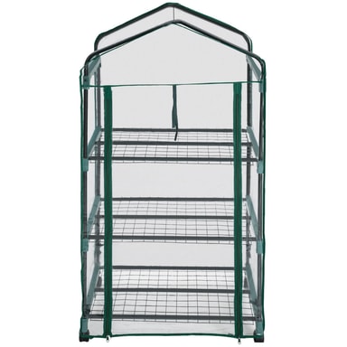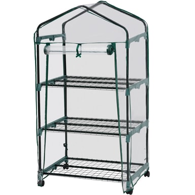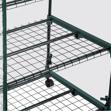 Kohokohdat • Vakaa teräsrunkorakenne. • Kuljetuskelpoinen muovisten pyörien ansiosta. • 3 kerrosta metallista säilytysritilää • Suojaa kasveja kylmältä, sateelta ja pakkaselta. • UV-stabiloitu PVC-kalvo. • Sisäänkäynti: n. 51 x 104 cm voidaan rullata kokoon ja sulkea. • Färg: läpinäkyvä