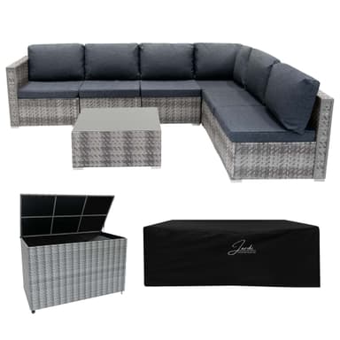 Muuta ulkotilasi tyylikkääksi ja toimivaksi turvasatamaan tällä tyylikkäällä harmaalla rottinki-moduulihuonekalusarjalla, jossa on yhteensopiva 700 litran säilytyslaatikko vaivattomaan järjestelyyn. Se on valmistettu korkealaatuisesta konekudotusta polyrottinkista ja tuettu tukevalla teräsrungolla. Sekä huonekalusarja että säilytyslaatikko on rakennettu kestämään pitkään. UV-suojattu ulkopinta estää haalistumista ja kulumista ja varmistaa, että sarja pysyy huippukunnossa kaudesta toiseen. Modulaarinen rottinkikalusteet on suunniteltu sekä sosiaalisiin kokoontumisiin että hiljaisiin rentoutumishetkiin. Siinä on kuusi muunneltavaa istuinosaa ja yhteensopiva pöytä, joten voit mukauttaa asettelusi joka tilanteeseen sopivaksi. Kevyt mutta tukeva teräsrunko varmistaa vaivattoman uudelleenasemoinnin, joten voit helposti säätää järjestelyä tilaan ja tarpeisiisi sopivaksi. Tämä setti tarjoaa monipuoliset istumapaikat jopa viidelle henkilölle, ja se on yhtä mukava kuin tyylikäskin. Pehmotyynyt parantavat oleskelukokemusta, kun taas niiden irrotettavat, käsinpestävät päälliset tekevät ylläpidosta helppoa. Karkaistusta lasista valmistettu pöytätaso lisää hienostuneisuutta ja tarjoaa sileän pinnan juomien ja välipalojen tarjoiluun tai koristeellisten esineiden esillepanoon. Joka sään kestävyyteen suunniteltu sarja sisältää vedenpitävän Oxford-sadesuojan, joka suojaa sateelta ja arvaamattomilta olosuhteilta ja varmistaa, että se pysyy raikkaana ja tyylikkäänä vähäisellä ylläpidolla. Paketin täydentää 700 litran rottinki-säilytyslaatikko, joka tarjoaa tyylikkään ja käytännöllisen ratkaisun ulkotilan pitämiseen sotkuttomana. Sen runsas kapasiteetti tekee siitä ihanteellisen tyynyjen, puutarhatyökalujen ja ulkoilutarvikkeiden säilyttämiseen, mikä varmistaa, että ne pysyvät suojattuna, kun niitä ei käytetä. Huolellisesti suunnitellut hydrauliset tuet mahdollistavat kannen pehmeän avaamisen, kun taas tukevat jalat ja integroidut pyörät tarjoavat sekä vakautta että liikkuvuutta. Parhaan suojan takaamiseksi säilytyslaatikossa on sisäänrakennettu vedenpitävä vuori, jossa on täysi vetoketju, joka suojaa sen sisältöä sateelta ja kosteudelta. Se on suunniteltu sekä vakautta että mukavuutta ajatellen, ja siinä on integroidut pyörät ja tukeva teräskahva, joten se on helppo siirtää tarvittaessa. Käytetäänpä sitten huonekalusarjan rinnalla tai erillisenä kappaleena, tämä säilytysratkaisu pitää ulkoalueesi siistinä ja järjestyksessä vähällä vaivalla. Korosta ulkotilaasi täydellisellä tyylin, mukavuuden ja käytännöllisyyden tasapainolla. Tämä setti on ihanteellinen vieraiden majoittamiseen tai rauhallisen pakopaikan luomiseen, ja se parantaa puutarhaa modernilla muotoilullaan ja vaivattomalla toiminnallaan. Tuotteen ominaisuudet: * Kestävä konekudottu polyrottinki * Joustava 7-osainen modulaarinen muotoilu * Irrotettavat ja pestävät päälliset * Reilu 700 litran säilytystilavuus * Vedenpitävä sadesuoja ja rintojen vuori Rottinkikalusteiden tekniset tiedot: * Huonekalujen väri: Harmaa * Tyynyn väri: Harmaa * Materiaaleja 3.2kg: Rungon materiaali: Teräs * Pöytälevyn materiaali: karkaistu lasi * Sadesuojan materiaali: Oxford-kangas * Kokonaismitat: 63 cm K x 260 cm L x 190 cm S * Kulman istuimen koko: 63 cm K x 70 cm L x 70 cm S * Istuimen keskikoko: * Korkeus 60 cm x 60 cm Mukana pehmuste: 40 cm * Käsinojan paksuus: 8,5 cm * Istuintyynyn paksuus: 8 cm * Selkätyynyn paksuus: 18 cm * Pöydän koko: 32,5 cm K x 60,5 cm L x 67,5 S * Lasin paksuus: 3 mm * Tilavuus: 12 kg Tuolin paino 0 kg Tekniset tiedot: * Väri: Harmaa * Paino: 21,9 kg * Laatikon materiaali: Polyrottinki * Rungon materiaali: Teräs * Vuorausmateriaali: Oxford * Korkeus: 80 cm / 0,8 m / 31,5"" * Leveys: 150 cm / 1,5 m / 59,1"" * Syvyys: 1,5 m / 59,1"" * 2 cm / 0,8 Tilavuus: 700L * UV-kestävyys: Kyllä Laatikon sisältö: * 2 x kulmasohvaistuinta * 4 x käsivarttamatonta sohvaistuinta * 1 x vedenpitävä sadesuoja * 1 x turvallinen säilytyslaatikko