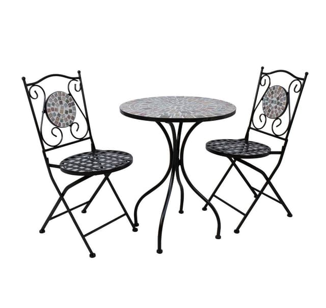 Parvekesarja CHECKER pöytä ja 2 taitettavaa tuolia. Pöytälevy ja tuolien selkänojat on koristeltu mosaiikkikuvioisilla laatoilla vaalealla taustalla. Pöydän ja tuolin jalat ja runko on valmistettu metallista ja viimeistelty mustalla jauhemaalauksella. Tuoli on taitettava. Pöydän mitat D60xH73,5cm. Pyöreän istuimen halkaisija on 38 cm. Istuimen korkeus on 47 cm. Painorajoitus 90 kg. Tuolin mitat taitettuna 38x99x17cm. SÄILYTYS: kesäkauden päätyttyä suosittelemme puutarhakalusteiden säilyttämistä sisätiloissa. Puhdista ja kuivaa huonekalut ennen varastointia. Käytä säilytykseen viileää, kuivaa ja hyvin ilmastoitua tilaa.