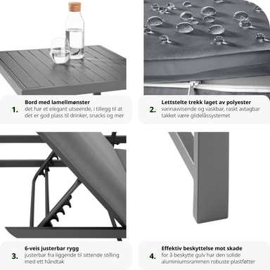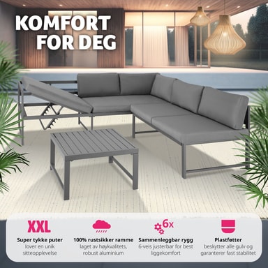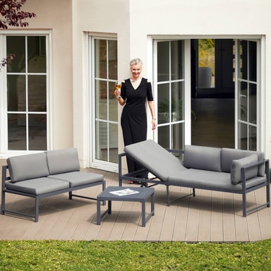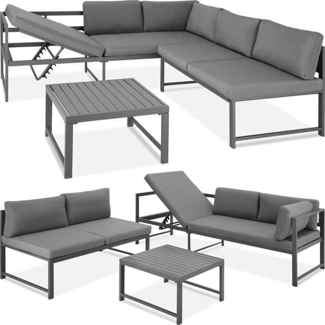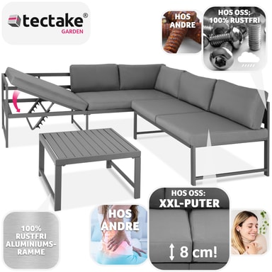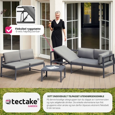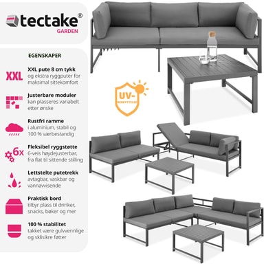 Tämän tectaken puutarhakalustesarjan yksittäiset elementit voidaan ryhmitellä eri tavoin, jolloin voit muotoilla kalusteet omien tarpeidesi mukaisiksi ja lisätä niihin persoonallisen ilmeen. Tyylikkään harmaan sävyisessä modernissa istuimessa on paksut tyynyt lisämukavuutta varten. Yhdessä yhden tuolin säädettävän selkänojan ja käytännöllisten käsinojien kanssa tämä tarkoittaa, että löydät ihanteellisen asennon maksimaalista rentoutumista varten. Vähän huoltoa vaativat, vettä hylkivät tyynyt ja vakaa alumiinirunko viimeistelevät tämän ruostumattoman oleskelusarjan ja tekevät siitä täydellisen ulkokalustesohvasarjan, pöytä mukaan lukien. Kaiken kukkuraksi mukana toimitetut pöydät houkuttelevalla muotoilulla ja tasaisella pinnalla tuovat lisää vetovoimaa ja käytännöllisyyttä. Täydellinen paikka rentoutumiseen ja viileästä ulkoilmaruokailusta nauttimiseen: tilaa Faro-puutarhakalustesetti tectakelta jo tänään.