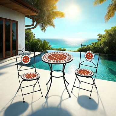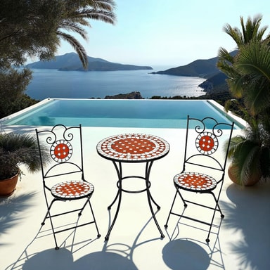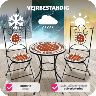 Mosaiikkipuutarhakalusteet ovat aina olleet suosittuja. Nostalgian, antiikin ja modernismin yhdistelmä luo miellyttävän harmonian, joka korostaa puutarhaa ja kutsuu viipymään. Tämä tectaken mosaiikkipuutarhakalustesarja koostuu keraamisesta mosaiikkikivilaatasta, jossa on teräsrunko, sekä kahdesta kokoontaitettavasta tuolista, jotka on myös varustettu mosaiikkityöllä. Tämäntyyppiset ulkokalusteet ovat erittäin kestäviä ja sopivat siten erinomaisesti käytettäväksi puutarhassa tai terassilla tai parvekkeella.