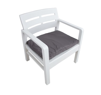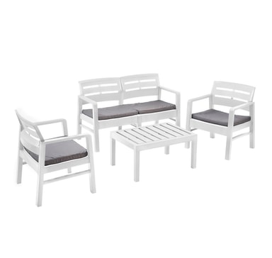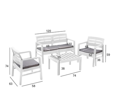 Puutarharyhmä JAVA pöytä, penkki ja 2 tuolia, valkoinen muovi. Penkin mitat 120x58xH74cm, tuolin mitat 63x58xH74cm, istuinsyvyys 48cm, istuinkorkeus 37cm. Sarja sisältää 4 istuintyynyä. Tyynyn mitat ovat 54x45x4cm. Pöydän mitat 74x55xH38cm. Painoraja per istuin 120kg. Materiaali: polypropeeni (PP). HUOLTO: muovihuonekalut eivät vaadi erityistä huoltoa. Puhdista pinnat säännöllisesti vedellä ja miedolla pesuaineliuoksella. Älä käytä valkaisuaineita tai hankaavia puhdistusaineita. SÄILYTYS: kesäkauden päätyttyä suosittelemme puutarhakalusteiden säilyttämistä sisätiloissa. Puhdista ja kuivaa huonekalut ennen varastointia. Käytä säilytykseen kuivaa, hyvin ilmastoitua tilaa.