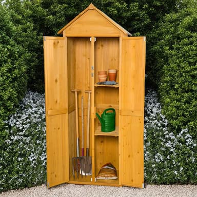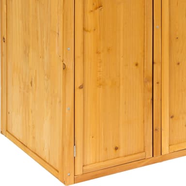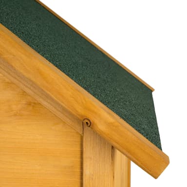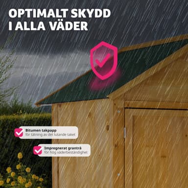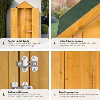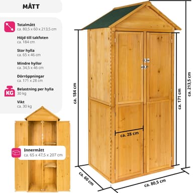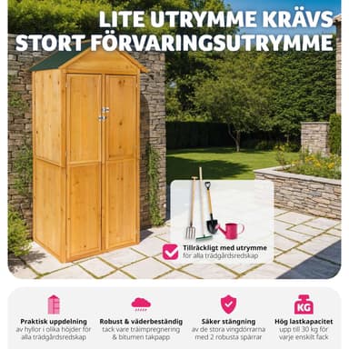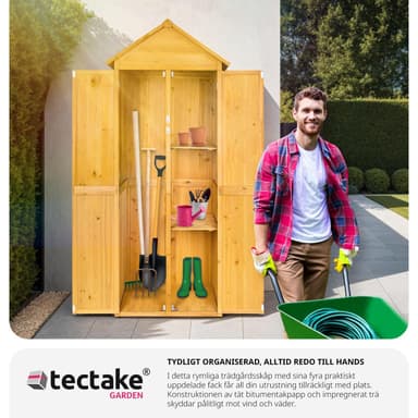 Tässä puisessa puutarhavajassa, jossa on harjakatto, voit säilyttää paljon puutarhavälineitä, joihin sinun on usein päästävä käsiksi. Vajan oikealla puolella on kaksi hyllyä, joilla voit helposti säilyttää pieniä esineitä.