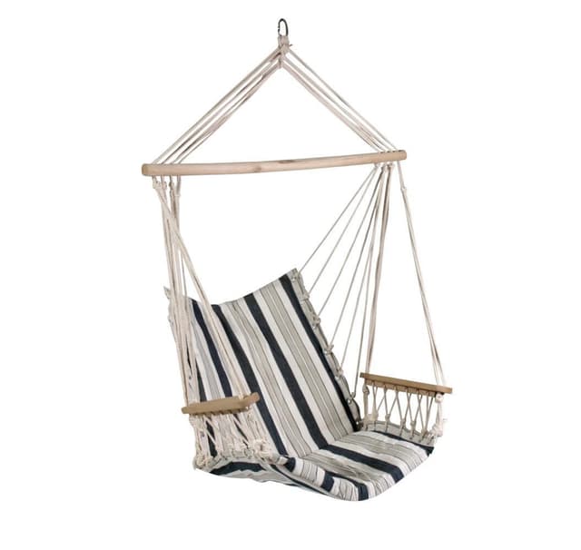 Riipputuoli HIP pehmustetulla istuimella, valko-sini raidallinen puuvilla, Istuimen leveys 48cm, syvyys 45cm, selkänojan korkeus 55cm. Puisen käsinojan pituus on 39cm. Painoraja 120kg.