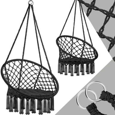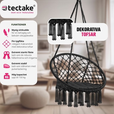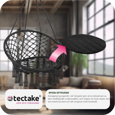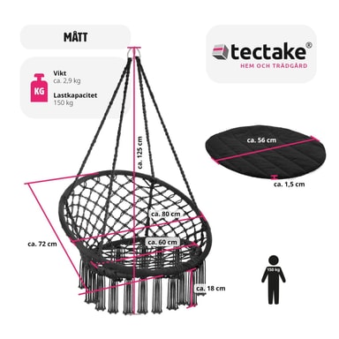 Tekniset tiedot • Kokonaismitat koottuna (KxSxK): n. 80 x 72 x 125 cm • Kokonaismitat purettuna (ØxK): n. 80 x 5 cm • Koko istuin: n. 80 x 5 cm • Halkaisija istuin: n. 60 cm • Mitat istuintyyny (ØxK): n. 56 x 1,5 cm • Tukiköydet edessä (ØxL): n. 1,5 x 91 cm • Tukiköydet takana (ØxL): n. 1,5 x 78 cm • Silmukoiden sisähalkaisija: n. 51 mm • Silmukoiden paksuus: n. 7 mm • Tupsujen pituus: n. 18 cm • Kantavuus: 150 kg • Paino: n. 2,9 kg • Materiaali: pulverimaalattu teräs, puuvilla, polyesteri