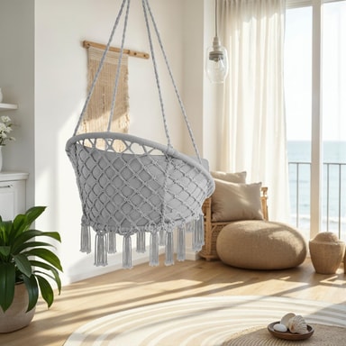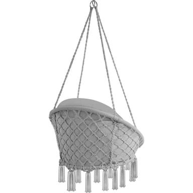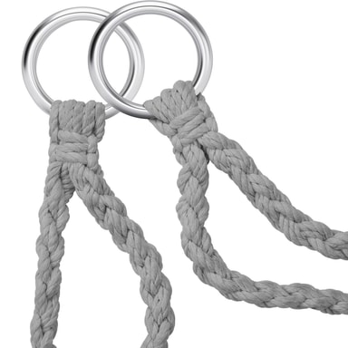 Kohokohdat • Taittuva riippukeinu paksulla, irrotettavalla ja mukavalla tyynyllä • Sopii sekä sisä- että ulkokäyttöön • Runko valmistettu tukevasta kudotusta kankaasta ja pulverimaalatusta teräksestä • Neljä vankkaa köyttä ja kaksi kiinnityssormusta • Koristeelliset hapsut alaosassa • Nopea koota ja purkaa • Helppo puhdistaa • Färg: harmaa