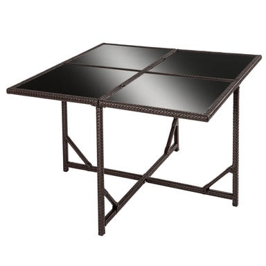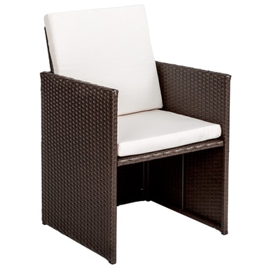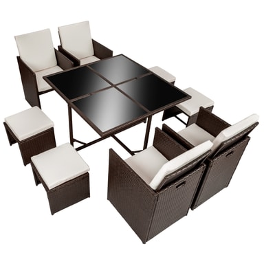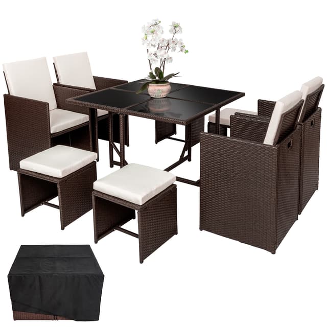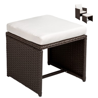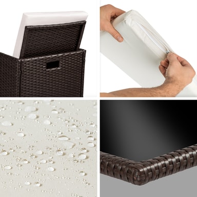 Käytetty polyrottimateriaali on suunniteltu erityisesti puutarhakalusteisiin. Polyrottinki on yleisnimitys keinotekoisesti tuotetuille polyuretaanista valmistetuille kudotuille materiaaleille, jotka edustavat teollisesti tuotettua vaihtoehtoa luonnolliselle rottingille. Uusi istuinsarjasi on siis pestävä, helppohoitoinen ja säänkestävä. Kermanväriset pehmustetut tyynyt ovat vedenkestäviä, irrotettavia ja helposti puhdistettavia sisäänrakennettujen vetoketjujen avulla. Karkaistu lasilevy on maalattu pohjasta mustaksi ja lupaa siten tyylikkään ulkonäön. Käsinojatuolissa on reunassa kahvasyvennys, ja niitä on helppo siirtää sitä kautta. Taitettavan selkänojan avulla nojatuoli ja jakkara voidaan yhdistää kompaktisti modulaariseksi järjestelmäksi. Mukana tuleva sadesuoja antaa lisäsuojaa, joten saat nauttia tästä upeasta tuolisarjasta pitkään.