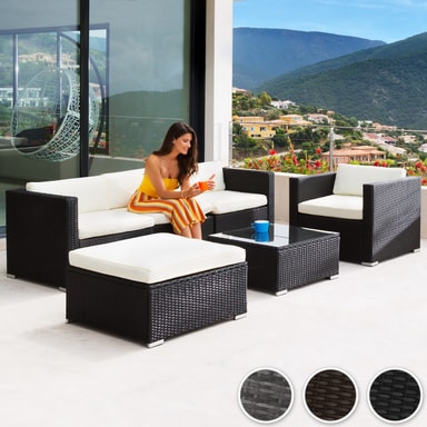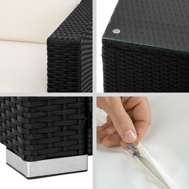 Tämä tectaken rottinkinen lounge-puutarhakalustesarja on valmistettu kestävästä polyrottingista, ja se koostuu pöydästä, sohvasta ja nojatuolista. Ulkokalustesarjan sohva voidaan myös erottaa 3 yksittäiseksi tuoliksi. Pöydän pinta on valmistettu lasista, mikä antaa sille tyylikkään ulkonäön ja tekee siitä helposti puhdistettavan. Sohvassa, tuolissa ja jakkarassa on mukavat, polyesteristä valmistetut istuintyynyt, jotka on väriltään täydellisesti sovitettu rottinkisarjaan. Lisäksi tyynynpäällisissä on vetoketju takana, mikä mahdollistaa helpon puhdistuksen. Pehmusteiden suojaamiseksi kosteudelta niiden pinta on kyllästetty, joten lika ja vesi tippuvat helposti pois (katso kuva). Erilaisten yksittäisten elementtien avulla setti voidaan järjestää toiveidesi ja tarpeidesi mukaan. Tällä laadukkaalla tectaken rottinkipuutarhakalustesarjalla kotipuutarhasi tai terassisi voidaan muuttaa omaksi ulkoilmaolohuoneeksesi.