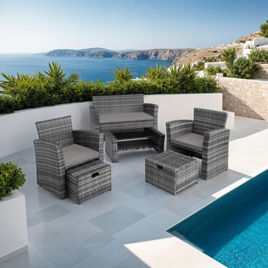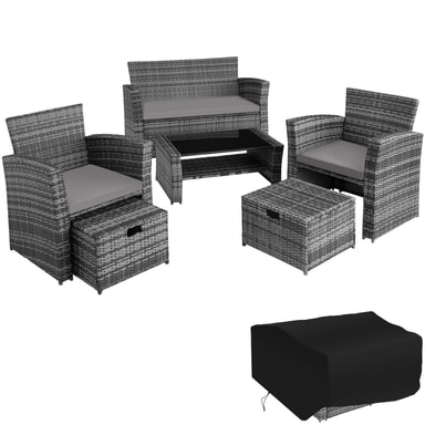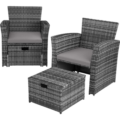 Tässä tectaken kutsuvassa rottinkipuutarhakalustesarjassa yhdistyvät tyylikäs muotoilu ja optimaalinen mukavuus. Pehmeät tyynyt ja jalkatukijakkarat lupaavat olohuoneen kaltaista rentoutumista ulkona. Kun jakkarat eivät ole käytössä, ne voidaan helposti liu'uttaa tuolien alle säilytystä varten, kun taas vettä hylkivät tyynyt voidaan säilyttää sohvan sisällä. Kotiterassisarjassa on pieni pöytä, joka sopii erinomaisesti välipalojen ja juomien säilyttämiseen, jotta voit nauttia rennosta ulkoruokailusta ystävien ja perheen kanssa. Pöydän lasikatto lisää tämän istuinsarjan tyylikästä muotoilua. Laadukkaan, kestävää polyrottinkia olevan punonnan ja vankan teräsjalustan ansiosta tämä tectaken helppohoitoinen rottinkipuutarhakalustesarja tekee varmasti vaikutuksen puutarhassasi.