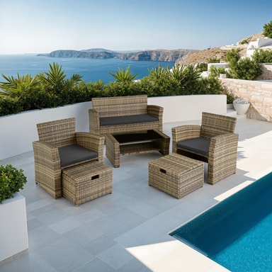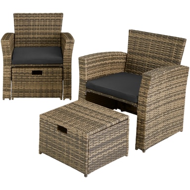 Tässä tectaken kutsuvassa rottinkipuutarhakalustesarjassa yhdistyvät tyylikäs muotoilu ja optimaalinen mukavuus. Pehmeät tyynyt ja jalkatukijakkarat lupaavat olohuoneen kaltaista rentoutumista ulkona. Kun jakkarat eivät ole käytössä, ne voidaan helposti liu'uttaa tuolien alle säilytystä varten, kun taas vettä hylkivät tyynyt voidaan säilyttää sohvan sisällä. Kotiterassisarjassa on pieni pöytä, joka sopii erinomaisesti välipalojen ja juomien säilyttämiseen, jotta voit nauttia rennosta ulkoruokailusta ystävien ja perheen kanssa. Pöydän lasikatto lisää tämän istuinsarjan tyylikästä muotoilua. Laadukkaan, kestävää polyrottinkia olevan punonnan ja vankan teräsjalustan ansiosta tämä tectaken helppohoitoinen rottinkipuutarhakalustesarja tekee varmasti vaikutuksen puutarhassasi.