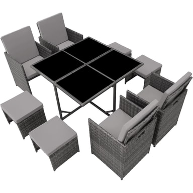 • Materiaali: istuinryhmä polyeteeniä, runko terästä, ruuvit ruostumatonta terästä, päällinen ja istuintyyny 100 % polyesteriä