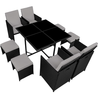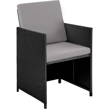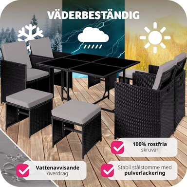 Tectaken Bilbao rottinkituolien avulla voit nauttia ulkoruokailusta terassilla, terassilla tai talvihuoneessa vuosien ajan. Käytetty polyrottinkimateriaali on suunniteltu erityisesti puutarhakalusteisiin. Polyrottinki on yleisnimitys keinotekoisesti tuotetuille polyeteenistä kudotuille materiaaleille, jotka ovat teollisesti tuotettu vaihtoehto luonnolliselle rottingille. Uusi istuinsarjasi on siis pestävä, helppohoitoinen ja säänkestävä. Pehmustetut tyynyt ovat vedenkestäviä, irrotettavia ja helposti puhdistettavia sisäänrakennettujen vetoketjujen avulla. Karkaistu lasilevy on maalattu pohjasta mustaksi ja lupaa siten tyylikkään ulkonäön. Nojatuolissa on reunassa kahvamukitus, jonka ansiosta niitä on helppo siirtää. Taitettavan selkänojan avulla nojatuoli ja jakkara voidaan yhdistää kompaktisti modulaariseksi järjestelmäksi. Mukana toimitettu kalustesuoja antaa lisäsuojaa, joten saat nauttia tästä upeasta tuolisarjasta pitkään. Tilaa uusi rottinkituolikalustesettisi tectakelta jo tänään ja tee puutarhastasi ulkoilmakeidas.