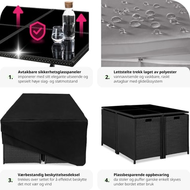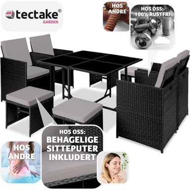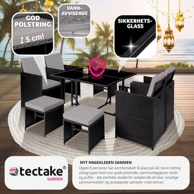 Tectaken Bilbao rottinkituolien avulla voit nauttia ulkoruokailusta terassilla, terassilla tai talvihuoneessa vuosien ajan. Käytetty polyrottinkimateriaali on suunniteltu erityisesti puutarhakalusteisiin.Tutustu ominaisuuksiin