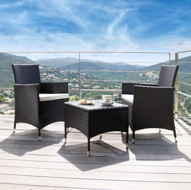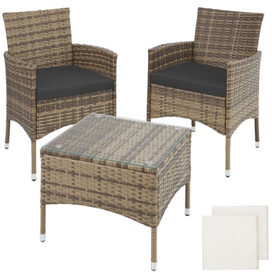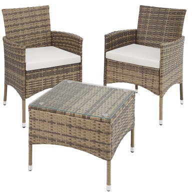 Parvekkeella, terassilla, terassilla tai puutarhassa: Tectaken rottinkisarjalla Lucerne voit nauttia kaikesta, mitä kesä tarjoaa, mukavasti omassa kodissasi. Kompaktin rakenteensa ansiosta tämä kahdesta tuolista ja yhdestä pienestä sohvapöydästä koostuva setti, jossa on lasinen pöytälevy, ei vie paljon tilaa, ja sen voi sijoittaa keskelle tai piilottaa nurkkaan, jotta voit hyödyntää ulkotilasi parhaalla mahdollisella tavalla. Kevyen rakenteensa ansiosta setti sopii erinomaisesti kuljetettavaksi ja siirreltäväksi, jotta voit ottaa viimeisetkin auringonsäteet kiinni. Ja kun huhtikuun sadekuuro iskee, voit nopeasti siirtää tuolisarjan talvihuoneeseen jatkamaan rentoutumishoitoa. Kokoonpanon jälkeen teräsrunko takaa maksimaalisen vakauden. Polyesteristä valmistetut istuintyynyt täydentävät rottinkikalusteiden värejä ja tekevät ulkoruokailusta tai rentoutumisesta mukavaa ja mukavaa. Tässä älykkäässä sarjassa yhdistyvät vähäinen huolto ja optimaalinen mukavuus. Istuintyynyjen pehmusteiden suojaamiseksi päällinen on käsitelty, joten lika ja vesipisarat valuvat yksinkertaisesti pois. Rentoudu ja nauti kesäauringosta ja kaikesta muusta, mitä sillä on tarjottavanaan, Tectaken Lucerne-rottinkisarjalla.