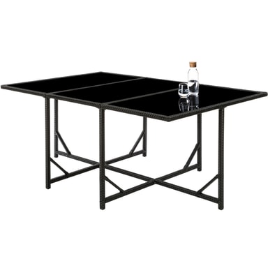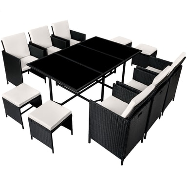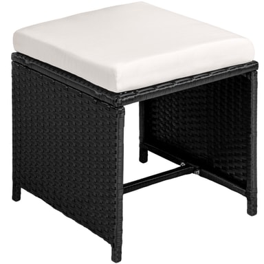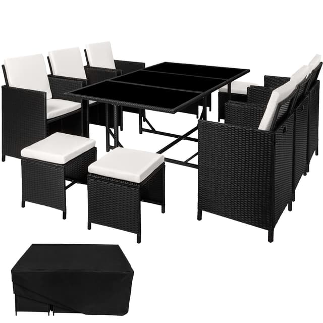 Käytetty polyrottimateriaali on suunniteltu erityisesti puutarhakalusteisiin. Polyrottinki on yleisnimitys keinotekoisesti tuotetuille polyuretaanista valmistetuille kudotuille materiaaleille, jotka edustavat teollisesti tuotettua vaihtoehtoa luonnolliselle rottingille. Uusi istuinsarjasi on siis pestävä, helppohoitoinen ja säänkestävä. Kermanväriset pehmustetut tyynyt ovat vedenkestäviä, irrotettavia ja helposti puhdistettavia sisäänrakennettujen vetoketjujen avulla. Karkaistu lasilevy on maalattu pohjasta mustaksi ja lupaa siten tyylikkään ulkonäön. Käsinojatuolissa on reunassa kahvasyvennys, ja niitä on helppo siirtää sitä kautta. Taitettavan selkänojan avulla tuolit ja jakkarat voidaan yhdistää kompaktisti modulaariseksi järjestelmäksi. Mukana tuleva sadesuoja antaa lisäsuojaa, joten saat nauttia tästä upeasta tuolisarjasta pitkään.