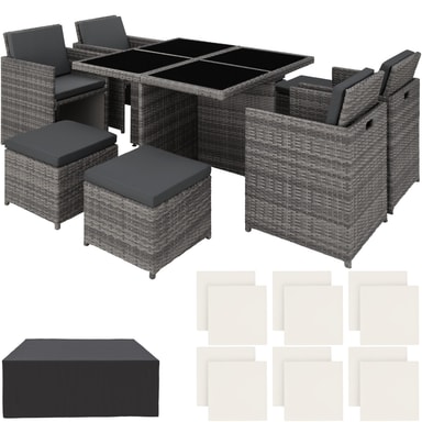 Tämä Tectaken upea rottinkisetti sopii täydellisesti ruokailuun, juomiseen ja seurusteluun, olipa kyseessä sitten puutarha tai talvihuone. Polyrottinki-tuolisarjaamme voidaan käyttää monipuolisesti, ja se parantaa visuaalisesti puutarhaa, terassia tai kasvihuonetta tarjoamalla keskeisen keskipisteen. Tyylikäs pöytä ja mukavat tuolit takaavat rentouttavat tunnit, jolloin voit viettää aikaa ystävien kanssa tai nauttia ulkoilmaruokailusta perheen kanssa. Rottinkisarja ei tee vaikutusta ainoastaan tyylikkäällä ulkonäöllään vaan myös pitkällä käyttöiällään, joka on mahdollista synteettisen polyrottingin ja säänkestävien elementtien ansiosta. Alhaisen painonsa ansiosta huonekaluja on helppo siirtää puhdistusta tai varastointia varten. Neljästä lasielementistä valmistettu pöytälevy on erittäin tyylikäs ja helppo puhdistaa. Erittäin mukavat, beiget polyesteristä valmistetut istuintyynyt on väriltään täydellisesti sovitettu yhteen rottinkisarjan kanssa, ja niissä on vetoketju takana, joten päälliset voidaan irrottaa helppoa puhdistusta varten. Pehmusteiden suojaamiseksi vedeltä pinta on vedenpitävä, joten lika- ja vesipisarat yksinkertaisesti vierivät pois. Tämä upea, käytännöllinen ja tyylikäs 8-paikkainen rottinkisetti Tectakelta sopii täydellisesti ulkokeitaasi luomiseen.