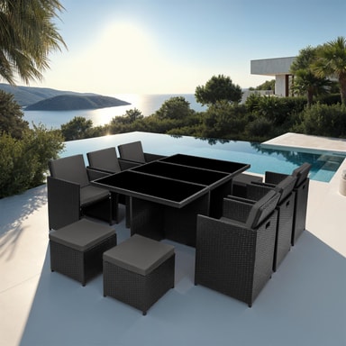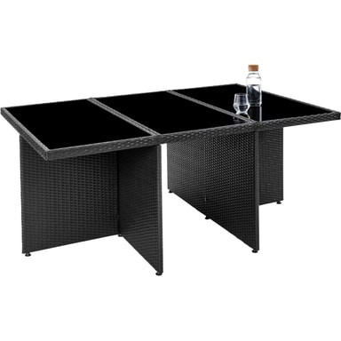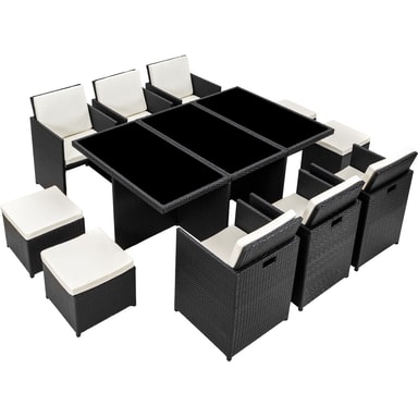 Tilaa uusi, 10-paikkainen New Yorkin rottinkisetti tectakelta jo tänään. Tyylikäs pöytä ja mukavat tuolit lupaavat rentoutumista ja mukavuutta, ihanteellinen unelmien ulkoilmaruokailukokemusta varten, mukavasti omassa kodissasi. Rottinki setti tekee vaikutuksen paitsi tyylikkäällä ulkonäöllään myös pitkällä elinkaarellaan, sillä polyrottinkiuitu on erittäin kestävää ja säänkestävää. Pienen painonsa ansiosta kalusteet on helppo kuljettaa haluamaasi paikkaan. Kolmesta lasielementistä valmistettu pöytälevy on erittäin tyylikäs ja helppo puhdistaa. Erittäin mukavat, beiget polyesteristä valmistetut istuintyynyt on väriltään täydellisesti sovitettu yhteen rottinkisarjan kanssa, ja niiden selkäpuolella on vetoketju, joka mahdollistaa helpon puhdistuksen. Pehmusteiden suojaamiseksi vedeltä pinta on vedenpitävä, mikä tarkoittaa, että lika- ja vesipisarat yksinkertaisesti vierivät pois. Tässä upeassa ulkokalustesarjassa on 6 tuolia, 4 jakkaraa ja 1 suuri pöytä, joten se sopii täydellisesti tähtijuhliin tai tapahtumiin. Tee puutarhastasi, terassistasi tai konservatoriostasi tyylikäs keidas tällä tectaken rottinkikalustesarjalla.