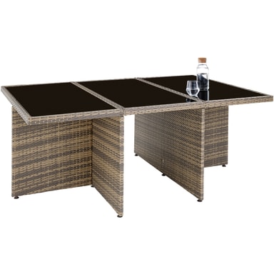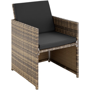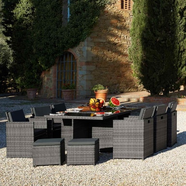 Tilaa uusi, 10-paikkainen New Yorkin rottinkisetti tectakelta jo tänään. Tyylikäs pöytä ja mukavat tuolit lupaavat rentoutumista ja mukavuutta, ihanteellinen unelmien ulkoilmaruokailukokemusta varten, mukavasti omassa kodissasi. Rottinki setti tekee vaikutuksen paitsi tyylikkäällä ulkonäöllään myös pitkällä elinkaarellaan, sillä polyrottinkiuitu on erittäin kestävää ja säänkestävää. Pienen painonsa ansiosta kalusteet on helppo kuljettaa haluamaasi paikkaan. Kolmesta lasielementistä valmistettu pöytälevy on erittäin tyylikäs ja helppo puhdistaa. Erittäin mukavat, beiget polyesteristä valmistetut istuintyynyt on väriltään täydellisesti sovitettu yhteen rottinkisarjan kanssa, ja niiden selkäpuolella on vetoketju, joka mahdollistaa helpon puhdistuksen. Pehmusteiden suojaamiseksi vedeltä pinta on vedenpitävä, mikä tarkoittaa, että lika- ja vesipisarat yksinkertaisesti vierivät pois. Tässä upeassa ulkokalustesarjassa on 6 tuolia, 4 jakkaraa ja 1 suuri pöytä, joten se sopii täydellisesti tähtijuhliin tai tapahtumiin. Tee puutarhastasi, terassistasi tai konservatoriostasi tyylikäs keidas tällä tectaken rottinkikalustesarjalla.