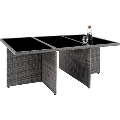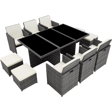 Tilaa uusi, 10-paikkainen New Yorkin rottinkisetti tectakelta jo tänään. Tyylikäs pöytä ja mukavat tuolit lupaavat rentoutumista ja mukavuutta, ihanteellinen unelmien ulkoilmaruokailukokemusta varten, mukavasti omassa kodissasi. Rottinki setti tekee vaikutuksen paitsi tyylikkäällä ulkonäöllään myös pitkällä elinkaarellaan, sillä polyrottinkiuitu on erittäin kestävää ja säänkestävää. Pienen painonsa ansiosta kalusteet on helppo kuljettaa haluamaasi paikkaan. Kolmesta lasielementistä valmistettu pöytälevy on erittäin tyylikäs ja helppo puhdistaa. Erittäin mukavat, beiget polyesteristä valmistetut istuintyynyt on väriltään täydellisesti sovitettu yhteen rottinkisarjan kanssa, ja niiden selkäpuolella on vetoketju, joka mahdollistaa helpon puhdistuksen. Pehmusteiden suojaamiseksi vedeltä pinta on vedenpitävä, mikä tarkoittaa, että lika- ja vesipisarat yksinkertaisesti vierivät pois. Tässä upeassa ulkokalustesarjassa on 6 tuolia, 4 jakkaraa ja 1 suuri pöytä, joten se sopii täydellisesti tähtijuhliin tai tapahtumiin. Tee puutarhastasi, terassistasi tai konservatoriostasi tyylikäs keidas tällä tectaken rottinkikalustesarjalla.