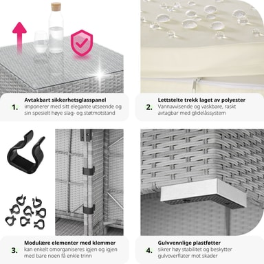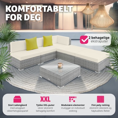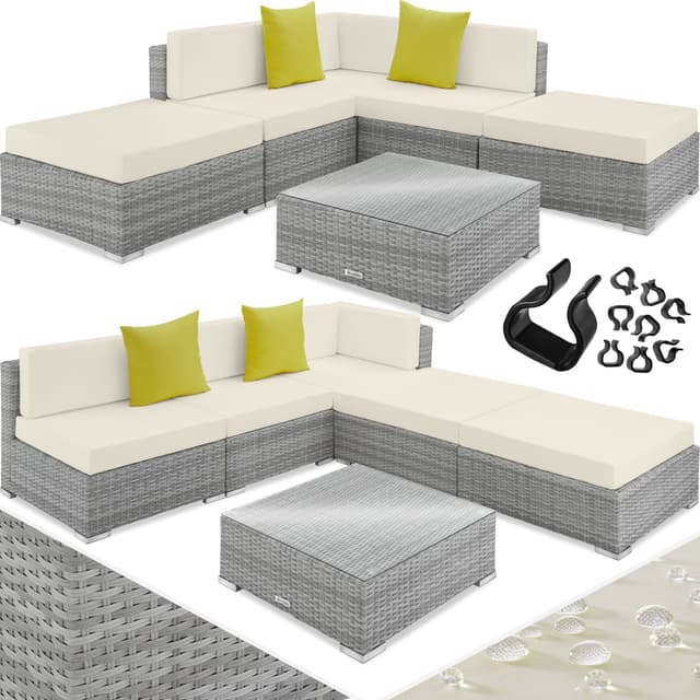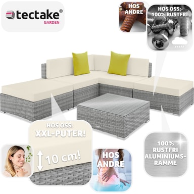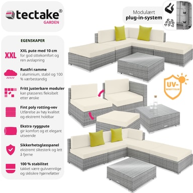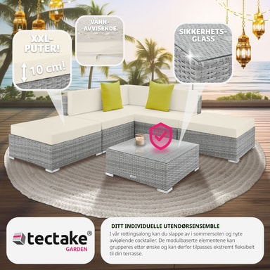 Puutarhassa tai sisätiloissa Tectake-polyrottinki-puutarhakalustesohvasarjaa voidaan käyttää monipuolisesti ja eri muodoissa, ja se parantaa visuaalisesti puutarhaa, terassia, kasvihuonetta tai olohuonetta. Tyylikäs pöytä on täydellinen paikka juomille ja välipaloille, joten voit nauttia rennosta ruokailusta ulkona. Mukavissa tuoleissa on paksut tyynyt, jotka tarjoavat varmasti rentouttavia tunteja, kun istut ystävien ja perheen kanssa. Puutarhakalusteiden istuinsarja tekee vaikutuksen paitsi tyylikkäällä ulkonäöllään myös pitkällä käyttöiällään polyrottinki-kudoksen ansiosta. Alhaisen painon ansiosta kalusteita on helppo kuljettaa ja sijoittaa uudelleen haluamaasi muotoon. Pöytien pöytälevy on valmistettu lasista, mikä antaa sille tyylikkään ulkonäön ja tekee siitä helposti puhdistettavan. Mukavat, polyesteristä valmistetut istuintyynyt on väriltään täydellisesti sovitettu yhteen rottinkisarjan kanssa, ja niiden selkäpuolella on vetoketju, joka mahdollistaa helpon puhdistuksen. Pehmusteiden suojaamiseksi vedeltä pinta on kyllästetty, joten lika- ja vesipisarat yksinkertaisesti vierivät pois. Erilaisten yksittäisten elementtien avulla puutarhakalustesarja voidaan järjestää toiveidesi ja tarpeidesi mukaan. Ulkokalustesarjan lisävarusteisiin kuuluu jopa kaksi lisätyynyä, jotka parantavat sen ulkonäköä entisestään. Tilaa tämä upea rottinkipuutarhakalustesarja Tectakelta kotiisi ja tee terassistasi tai puutarhastasi ulkoilmaolohuone.