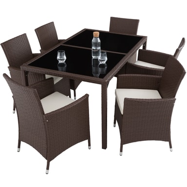 Tämä Tectaken 6-paikkainen polyrottinki-tuolisarja sopii täydellisesti kaikkiin ulkoruokailutarpeisiisi. Käytetty polyrottinkimateriaali on suunniteltu erityisesti puutarhakalusteisiin, sillä se on säänkestävä ja erittäin kestävä. Polyrottinki on yleisnimitys keinotekoisesti tuotetuille polyeteenistä kudotuille materiaaleille, jotka ovat teollisesti tuotettu vaihtoehto luonnonrottinkille. Uusi istuintuoli- ja pöytäsarjasi on siis pestävä, helppohoitoinen ja säänkestävä. Kermanväriset pehmustetut tyynyt ovat vedenkestäviä, irrotettavia ja helposti puhdistettavia sisäänrakennettujen vetoketjujen ansiosta. Pöydässä on karkaistu lasilevy, jonka pohja on maalattu mustaksi ja joka takaa tyylikkään ulkonäön. Mukana toimitettu sadesuoja antaa lisäsuojaa, jotta voit nauttia upeasta tuolista vuosien ajan. Tilaa tämä upea polyrottinki-tuolisarja Tectakelta jo tänään ja tee terassistasi tai terassista täydellinen, ulkona sijaitseva ruokailutila.