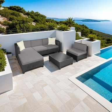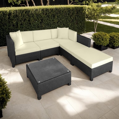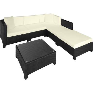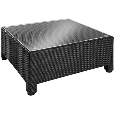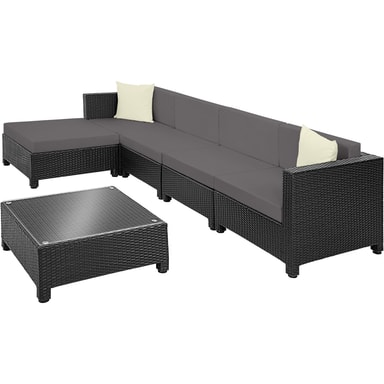 Tämä pöydän, sohvan ja nojatuolin sisältävä rottinkipuutarhakalustesarja on valmistettu alumiinista ja päällystetty polyrottingilla. Näin saadaan aikaan alhainen paino vakaudesta tinkimättä. Lasista valmistettu pöytäpinta näyttää erittäin tyylikkäältä ja on helppo puhdistaa. Polyesteristä valmistetut erittäin mukavat istuintyynyt on väriltään täydellisesti sovitettu mustaan rottinkisarjaan, ja niiden selkäpuolella on vetoketju, joka mahdollistaa helpon puhdistuksen. Pehmusteiden suojaamiseksi kosteudelta ja lialta pinta on kyllästetty. Erilaisten yksittäisten elementtien avulla setti voidaan järjestää toiveidesi mukaan. Tilaa tämä kaunis lounge-puutarhakalustesarja Tectakelta ja kohenna näkyvästi kodin ulkopuutarhaa tai terassia.