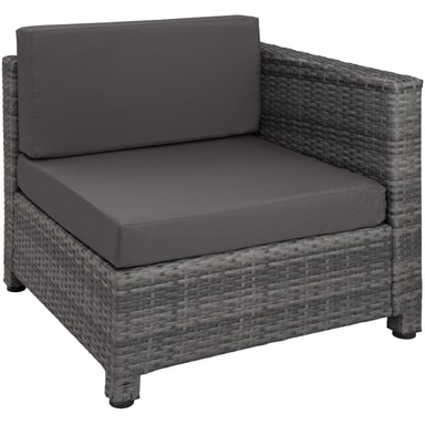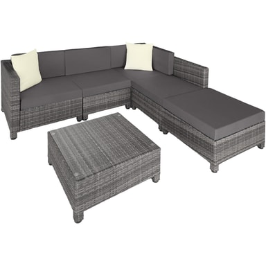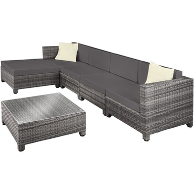 Tämä pöydän, sohvan ja nojatuolin sisältävä rottinkipuutarhakalustesarja on valmistettu alumiinista ja päällystetty polyrottingilla. Näin saadaan aikaan alhainen paino vakaudesta tinkimättä. Lasista valmistettu pöytäpinta näyttää erittäin tyylikkäältä ja on helppo puhdistaa. Polyesteristä valmistetut erittäin mukavat istuintyynyt on väriltään täydellisesti sovitettu mustaan rottinkisarjaan, ja niiden selkäpuolella on vetoketju, joka mahdollistaa helpon puhdistuksen. Pehmusteiden suojaamiseksi kosteudelta ja lialta pinta on kyllästetty. Erilaisten yksittäisten elementtien avulla setti voidaan järjestää toiveidesi mukaan. Tilaa tämä kaunis lounge-puutarhakalustesarja Tectakelta ja kohenna näkyvästi kodin ulkopuutarhaa tai terassia.