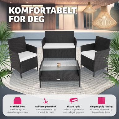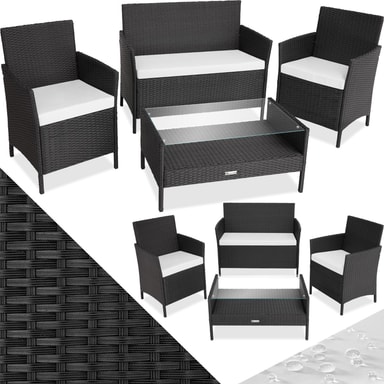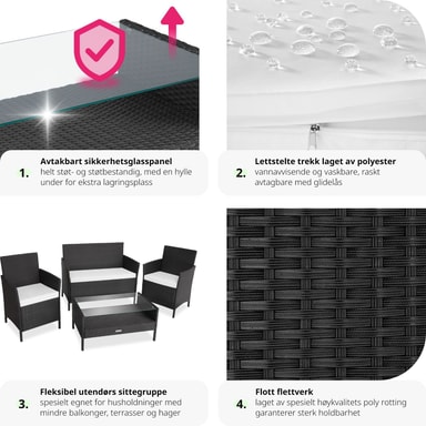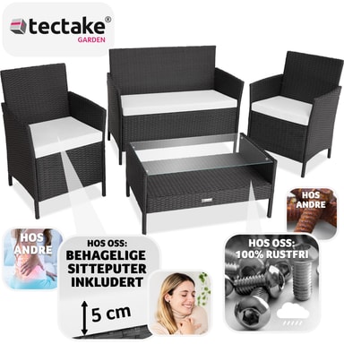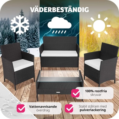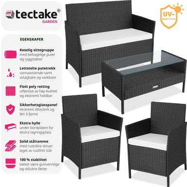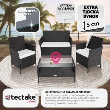 Tyylikäs, kestävä ja helppohoitoinen: Tectaken rottinkipuutarhasetti Madeira yhdistää korkean toimivuuden ja suuren mukavuuden. Kaksi tuolia ja istuinsohva, joissa on kevyt teräsrunko ja muovista valmistettu rottinkikudos, sopivat erinomaisesti ulkokäyttöön. Irrotettavat tyynynpäälliset ovat väriltään täydellisesti kalustesarjan kanssa yhteensopivia, ja ne on helppo puhdistaa kostealla liinalla. Litteä pöytä, jossa on säilytyshylly irrotettavan, massiivisesta turvalasista valmistetun paneelin alla, on kalustesarjan keskipiste. Nauti välimerellisistä kesäilloista terassillasi tai puutarhassasi loikoillessasi mukavassa rottinkipuutarhasarjassa Madeira by tectake.