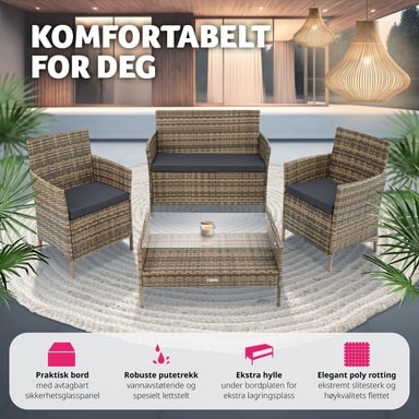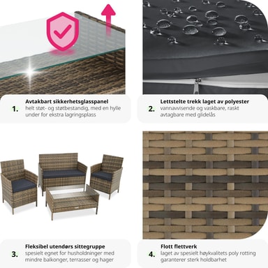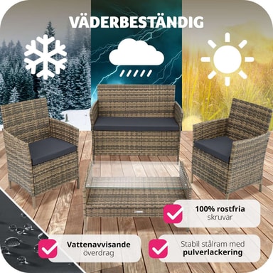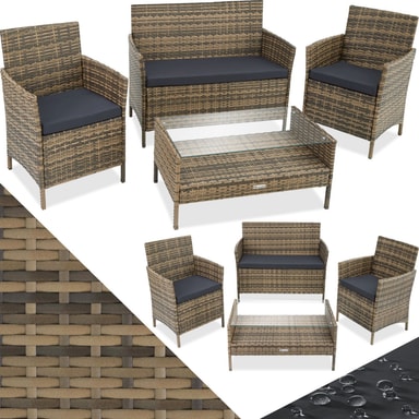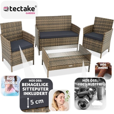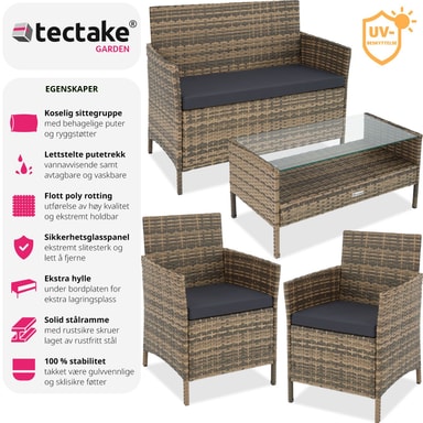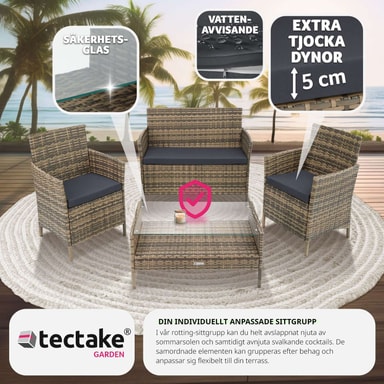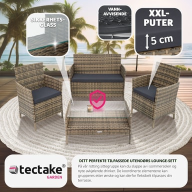 Tyylikäs, kestävä ja helppohoitoinen: Tectaken rottinkipuutarhasetti Madeira yhdistää korkean toimivuuden ja suuren mukavuuden. Kaksi tuolia ja istuinsohva, joissa on kevyt teräsrunko ja muovista valmistettu rottinkikudos, sopivat erinomaisesti ulkokäyttöön. Irrotettavat tyynynpäälliset ovat väriltään täydellisesti kalustesarjan kanssa yhteensopivia, ja ne on helppo puhdistaa kostealla liinalla. Litteä pöytä, jossa on säilytyshylly irrotettavan, massiivisesta turvalasista valmistetun paneelin alla, on kalustesarjan keskipiste. Nauti välimerellisistä kesäilloista terassillasi tai puutarhassasi loikoillessasi mukavassa rottinkipuutarhasarjassa Madeira by tectake.