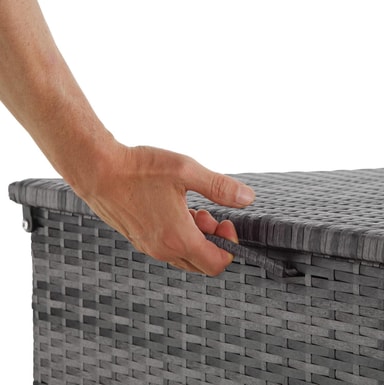 Kohokohdat • Vakaa säilytyslaatikko, jossa on paljon säilytystilaa • Laadukas kudos UV-säteilyä kestävää polyrattania • Kestävä ja kevyt alumiinirunko • Säänkestävä ja anti- ruostumattomasta rakenteesta • Vahvistettu kansi kaasujousilla, jotka avautuvat ja sulkeutuvat helposti • Poistettava sisävuori • Sivulla olevat kahvat • Muovijalat suojaavat lattiaa • Nopea ja helppo koota • • Helppo hoitaa • Färg: harmaa