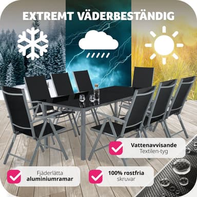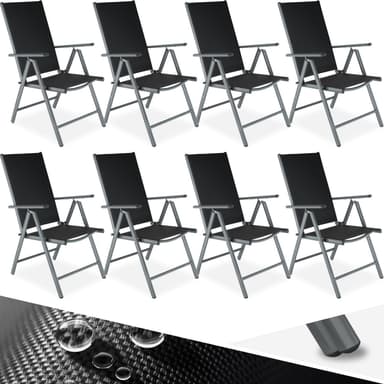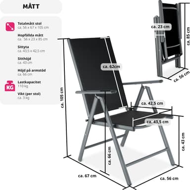 Tekniset tiedot • Istuinpinta (LxS): 43,5 x 42,5 cm • Kokonaisleveys: 56 cm • Selkänoja: 62 cm • Istuinkorkeus: n. 43 cm • Kannattimen korkeus lattiasta: n. 43 cm • Korkeus käsinojasta lattiaan: n. 66 cm • Kokonaismitat (LxSxK): 67 x 56 x 105 cm • Mitat (kokoontaitettuna) (LxSxK): 56 x 23 x 85 cm • Kantavuus: n. 110 kg • Paino: 3,1 kg kappalepaino • Materiaali: Alumiinirunko, muoviosat, muovipinnoitettua polyesterikuitua . Toimitus • 8 kokoontaitettavaa puutarhatuolia