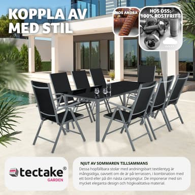 Tämä tyylikäs taittuva puutarhatuoli Tectaken korkealla selkänojalla sopii täydellisesti rentouttavaan illanviettoon ulkotilassasi, olipa se sitten puutarhassa, terassilla tai parvekkeella auringossa. Ulkona käytettävän ruokailutuolin synteettinen verkkokangas on kestävää, mukautuu optimaalisesti kehoon ja tarjoaa hyvän ilmanvaihdon istuessa. Metallirunkoista selkänojaa voidaan säätää 7 kulmaan, ja tuoli voidaan taittaa kokonaan kokoon tilaa säästävää säilytystä varten. Lisäksi tuoli on erittäin kevyt alumiinista valmistetun perusrungon ansiosta. Muiden huonekalujen, kuten puutarhapöydän, ja lisävarusteiden, kuten aurinkolamppujen, ohella voit muuntaa ulkotilasi ja terassisi täydelliseksi ulkoilmakeittiöksi ja nauttia raikkaasta ruokailukokemuksesta mukavasti omassa kodissasi. Näitä tuoleja on saatavana erimittaisina sarjoina, joten löydä itsellesi sopivin. Älä etsi enää täydellisiä tuoleja täydentämään puutarhapöytääsi ja täydentämään ruokailusettiäsi, nämä Tectaken alumiiniset puutarhatuolit tekevät varmasti vaikutuksen.