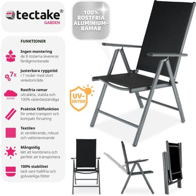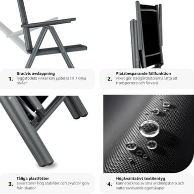 Kohokohdat • Superkevyt ja vakaa • Taitettava • Pinnoitetusta alumiinista valmistettu perusrunko • Synteettinen verkko takaa hyvän ilmanvaihdon • Helppo puhdistaa ja pestä • Korkea selkänoja, jossa on 7 kallistussäätöä • Mukavat istuma-asennot • Färg: antrasiitti