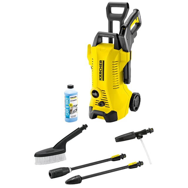 Puhdista muta pihalta, polkupyörästä tai auton pinnalta Kärcher K 3 -painepesurilla. Laitteen mukana tulee useita lisäosia ja siinä on 3 paineasetusta, joista löytyy jokaiseen tarpeeseen sopiva vedenpaineen taso.