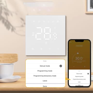 Useita tiloja: Tämä termostaatti tarjoaa erilaisia tiloja elämäntyyliisi sopiviksi. Valitse manuaalitila suoria lämpötilan säätöjä varten, ohjelmointitila viikoittaisten lämmitysaikataulujen asettamiseen, väliaikainen ohjelmointitila aikataulun ohittamiseen tarvittaessa ja poissaolotila energiansäästöön ollessasi poissa. Näiden tilojen joustavuus varmistaa, että lämmitysjärjestelmäsi on aina optimoitu mukavuuttasi ja energiatehokkuuttasi varten. Vaihda helposti tilojen välillä sovelluksen tai termostaatin intuitiivisen käyttöliittymän kautta.