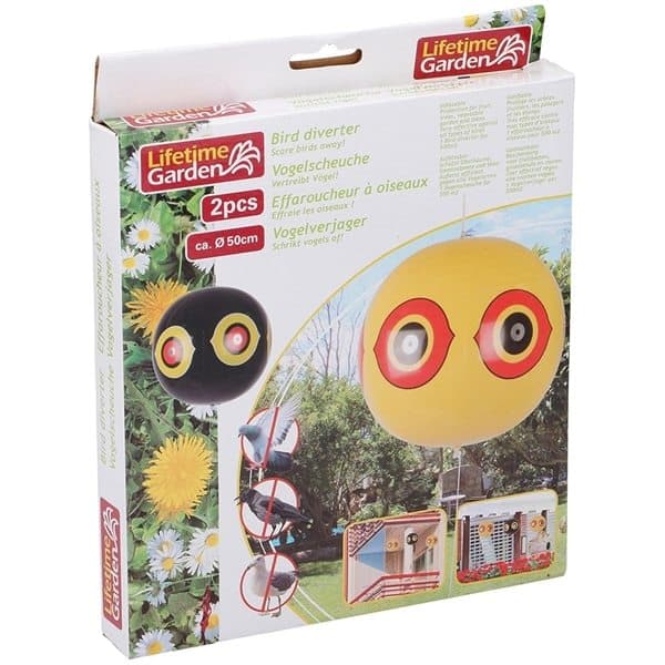 Linnunpelätin suuren puhallettavan pallon muodossa, jossa on heijastavat silmät ja lepattavat nauhat. Näillä hauskoilla lintuja pelottelevilla palloilla pidät linnut poissa puutarhasta helposti, mutta tehokkaasti ja estät lintuja syömästä kaikkia kirsikoita ja pidät terassin puhtaana lintujen ulosteista. Pallot suurilla silmillä ja lepattavilla nauhoilla tekee pelottavan vaikutuksen lintuihin, kun taas meille ne ovat vain koristeellinen yksityiskohta puutarhassa. Kiinnitä ne hedelmäpuuhun, terassille, katolle tai muille alueille, jotka haluat pitää vapaina linnuista. Pallot myydään 2-pakkauksessa. Määrä pakkauksessa: 2 Väri: Keltainen / musta Mitat (halkaisija): 50 cm