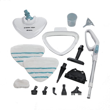 Steam Mop 10-in-1 on höyrypesukone, josta tulee käytännöllinen, monitoiminen höyrygeneraattori lisävarusteiden avulla. Sillä voi puhdistaa erilaisia pintoja sekä poistaa mikrobit ja bakteerit ilman pesuaineita. Käytännöllinen Steam Mop 10-in-1 on kätevä säilyttää, joten se on monipuolinen ja huomaamaton apuväline. Tämä on ihanteellinen tuote, kun kodin pinnat halutaan syväpuhdistaa: sillä voi desinfioida mattoja ja lattioita, irrottaa sitkeää likaa ja rasvaa miltä tahansa pinnalta, poistaa kalkkeumat WC-pöntöstä, kaapia jäämät keittiöliesistä, puhdistaa kaakelisaumat, desinfioida hankalimmatkin kolkat sekä raikastaa tekstiilit ja sohvat. Desinfioi, puhdista ja irrota rasva kaikkialta kodistasi kätevästi ja nopeasti 10-in-1-mopilla!