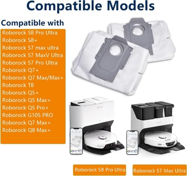 Yhteensopiva seuraavien kanssa: Roborock S8, S8+, S8 Pro Ultra, S7 MaxV Ultra, S7 Pro Ultra, Q7+, Q7 Max+, T8, Q5+, G10S Pro, Q7 Max+ ja Q8 Max+