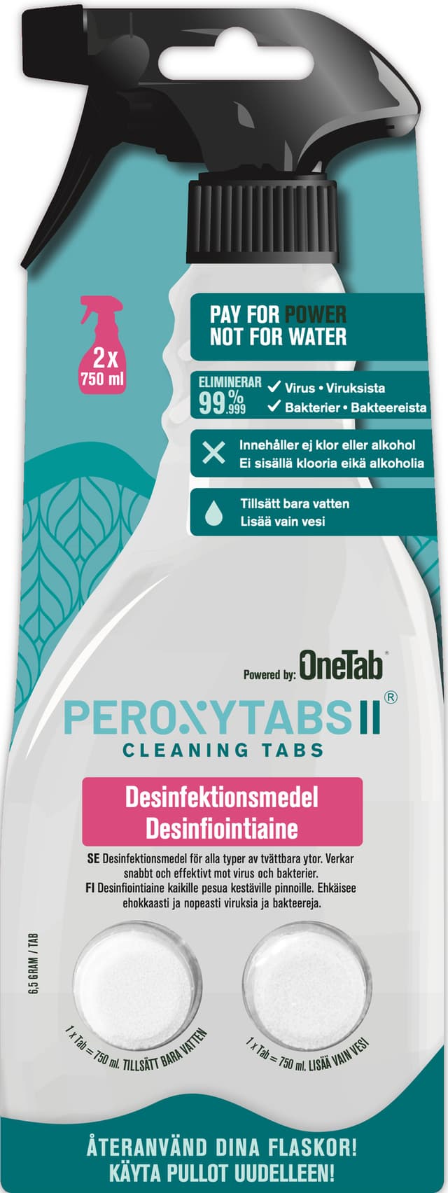 OneTab-pesuainetabletilla voit pestä kaikki kotisi pinnat tehokkaasti ympäristöystävällisemmin vähentäen muovinkäyttöä ja vedensiirtoa. Pakkaukseen sisältyy kaksi tablettia, joista kumpikin liukenee helposti 750 ml vettä ja poistaa 99,999 % bakteereista ja viruksista.