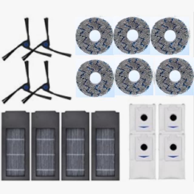Harjat ja suodattimet: Pakkaus sisältää 4 sivuharjaa, 6 moppiliinaa, 4 suodatinta, 4 pölypussia, jotka ovat yhteensopivia Ecovacs X2 / X2 Pron kanssa.
