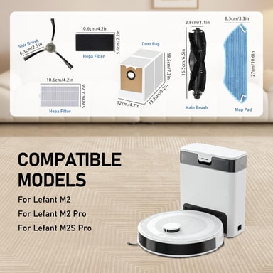 Kattava vaihtosarja: Tämä täydellinen vaihtosarja varmistaa, että Lefant M2-, M2 Pro- tai M2S Pro -robotti-imurisi ylläpitää huipputehonsa. Se sisältää tärkeät komponentit, kuten pääharjan, sivuharjat, suodattimet, moppityynyt ja pölypussit, jotka kaikki on suunniteltu integroitumaan saumattomasti Lefant-imuriisi. Näiden osien säännöllinen vaihtaminen optimoi puhdistustehokkuuden, pidentää robotti-imurisi käyttöikää ja pitää kotisi tahrattomana. Tämä sarja sisältää kaiken tarvittavan tasaiseen ja tehokkaaseen siivoukseen varmistaen, että Lefant-robotti-imurisi toimii parhaalla mahdollisella tavalla.