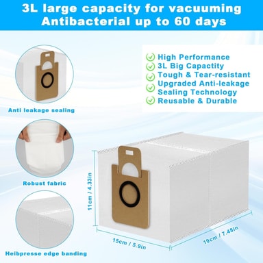 Suuri kapasiteetti: 3 litran tilavuuden ansiosta nämä pölypussit mahdollistavat pidemmän käyttöajan ennen vaihtoa. Tämä säästää aikaa ja vaivaa, koska sinun ei tarvitse vaihtaa pussia niin usein. Suuri kapasiteetti on erityisen hyödyllinen suuremmissa kodeissa tai jos imuroit usein. Pölypussit on valmistettu korkealaatuisesta materiaalista, joka kestää repeytymistä ja vuotoja, joten voit luottaa niiden pitävän pölyn ja lian sisällään. Nauti huolettomasta siivouksesta ja vähemmästä huollosta näiden suurikokoisten pölypussien avulla.