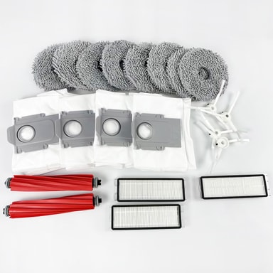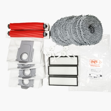 Kattava lisävarustesarja: Tämä sarja sisältää pääharjat, sivuharjat, pölynimurin suodattimet, pölynimuripussit ja moppityynyt.