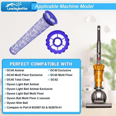 Helppo asennus ja huolto: Nauti vaivattomasta suodattimen vaihdosta käyttäjäystävällisen suunnittelumme avulla, joka on yhteensopiva Dyson DC40 -sarjan kanssa. Suodattimet on suunniteltu tarkasti sopimaan saumattomasti Dyson DC40 Animal-, DC40 Exclusive-, DC40 Multi Floor-, DC40 Multi Floor Exclusive-, DC40 Origin-, DC40 Origin Exclusive- ja DC40 Total Clean -imuriisi, mikä tekee asennuksesta nopeaa ja vaivatonta. Pestävä esisuodatin voidaan helposti huuhdella vedellä ja ilmakuivata, mikä yksinkertaistaa huoltoa. Pidä Dyson DC40 -imurisi toiminnassa parhaalla mahdollisella tavalla mahdollisimman pienellä vaivalla, mikä varmistaa tasaisen puhdistustehon ja terveellisemmän kotiympäristön. Katso osanumerot 922676-01, 922676-02 ja 923587-02 yhteensopivuuden varmistamiseksi.