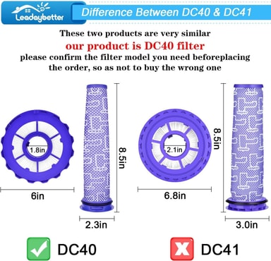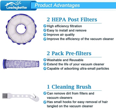 Erinomainen suodatusteho: Koe parannettu ilmanpuhdistus HEPA-jälkisuodattimellamme ja pestävällä esisuodattimellamme, jotka on suunniteltu huolellisesti yhteensopiviksi Dyson DC40 -sarjan imureiden kanssa. Tämä suodatinsarja kerää tehokkaasti pölyä, siitepölyä, eläinten hilsettä ja muita allergeeneja, mikä varmistaa puhtaamman ja terveellisemmän elinympäristön. HEPA-suodatin vangitsee mikroskooppisia hiukkasia, kun taas esisuodatin suojaa moottoria roskilta, mikä pidentää Dyson DC40 Animal-, DC40 Exclusive-, DC40 Multi Floor-, DC40 Multi Floor Exclusive-, DC40 Origin-, DC40 Origin Exclusive- ja DC40 Total Clean -imurisi käyttöikää. Säännöllinen suodattimen vaihto ylläpitää optimaalisen imutehon ja suodatustehokkuuden.
