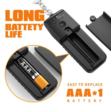 Helppo aktivointi ja käyttö: Henkilökohtaisen hälyttimen aktivointi on yksinkertaista ja intuitiivista: vedä vain avaimenperästä käynnistääksesi 130 dB:n hälytyksen ja vilkkuvan LED-valon. Deaktivoidaksesi sen, aseta tappi takaisin paikalleen. LED-valoa voidaan käyttää myös itsenäisesti taskulamppuna painamalla laitteen takana olevaa painiketta. Tämä käyttäjäystävällinen muotoilu varmistaa, että kuka tahansa, iästä tai teknisistä taidoista riippumatta, voi nopeasti ja tehokkaasti käyttää hälytintä hätätilanteessa. Hälytin toimii 3A-paristoilla, jotka sisältyvät pakkaukseen, joten se on heti käyttövalmis. Vähäisen paristovarauksen ilmaisin, vilkkuva valo, varoittaa, kun on aika vaihtaa paristot, mikä varmistaa jatkuvan suojan.