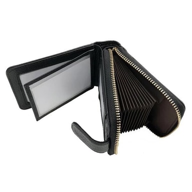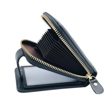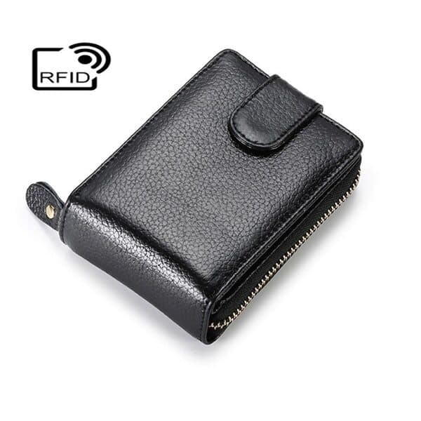 Nahkainen RFID-lompakko, jossa on paikat seteleille, luottokorteille, ajokortille ja henkilökortille. Se on sopivan kokoinen (11,5 x 8 x 3,5 cm) ja tilava, jossa on vetoketjut ja säppi. Tässä näppärässä lompakossa / korttikotelossa on sähkömagneettinen suojaus, joka suojaa korttejasi skimmaukselta ollessasi ostoksilla ja matkoilla. Tämä estää varkaita varastamasta digitaalisesti korttitietojasi, rahaa ja muita henkilökohtaisia tietojasi. Lompakko suljetaan tukevasti vetoketjulla ja painikkeella.