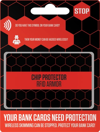 Stop! Chip Protector turvaa henkilökohtaiset tietosi esimerkiksi RFID-lukijoilla tapahtuvien tietovarkauksien varalta. Aseta suoja lompakkoosi ja suojaa jopa seitsemän eri korttia samanaikaisesti.