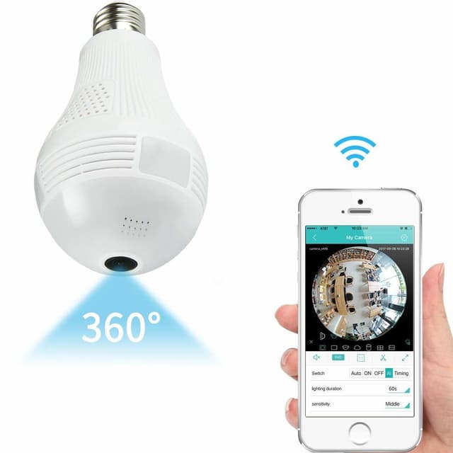 Seuraa suoraa 360 astetta WiFi-yhteyden kautta: Ihanteellinen, jos olet huolissasi lapsistasi, vanhemmista vanhemmista tai murrosta. 360-kameralla on huomaamaton ilme ja se toimii wifin kautta, mikä tekee siitä helpon sijoittaa kotiin, mökkiin tai toimistoon. Mukana on kiinnike, mutta se voidaan myös ruuvata tavalliseen E27-alustaan.