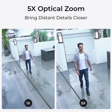 Tallenna jokainen yksityiskohta terävässä 4K Ultra HD -kuvassa. 8 MP kenno tuottaa selkeää, korkearesoluutioista videota, ja 5x optinen zoom suurentaa kauempana olevia kohteita heikentämättä laatua – ihanteellinen ajoteille, sisäänkäynteihin tai laajoille piha-alueille.